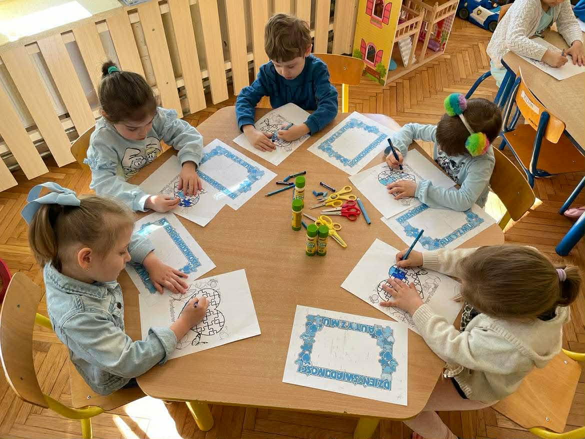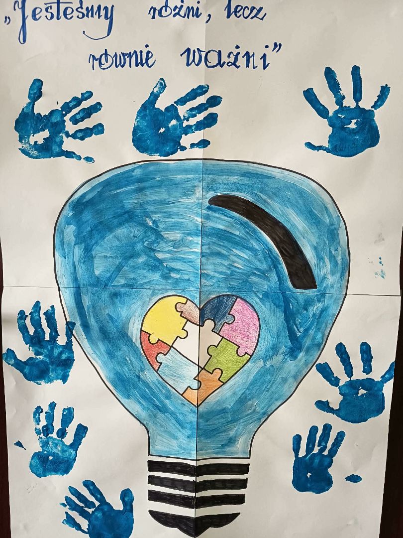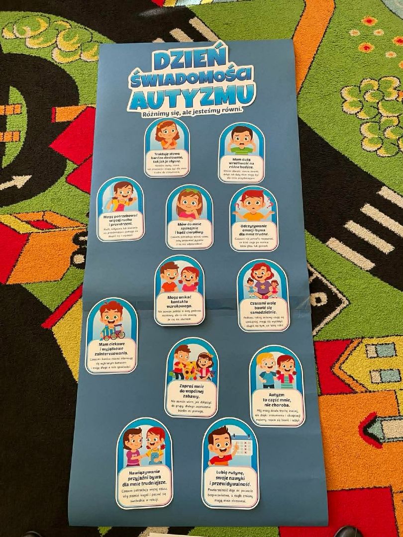 2 kwietnia w naszym przedszkolu było wyjątkowo niebiesko! Obchodziliśmy Światowy Dzień Świadomości Autyzmu, który stał się dla nas piękną lekcją empatii. Podczas wspólnych zabaw i ćwiczeń sensorycznych przedszkolaki mogły na własnej skórze poczuć, jak różnie odbieramy świat wokół nas. Próbowaliśmy zrozumieć, że każdy z nas ma inne potrzeby – jedni kochają mocne uściski, inni potrzebują chwili ciszy. Zwieńczeniem dnia były wspólne prace plastyczne, które pokazały, że choć każdy z nas jest innym „puzzlem”, to razem tworzymy jeden, piękny i barwny obraz naszej grupy.